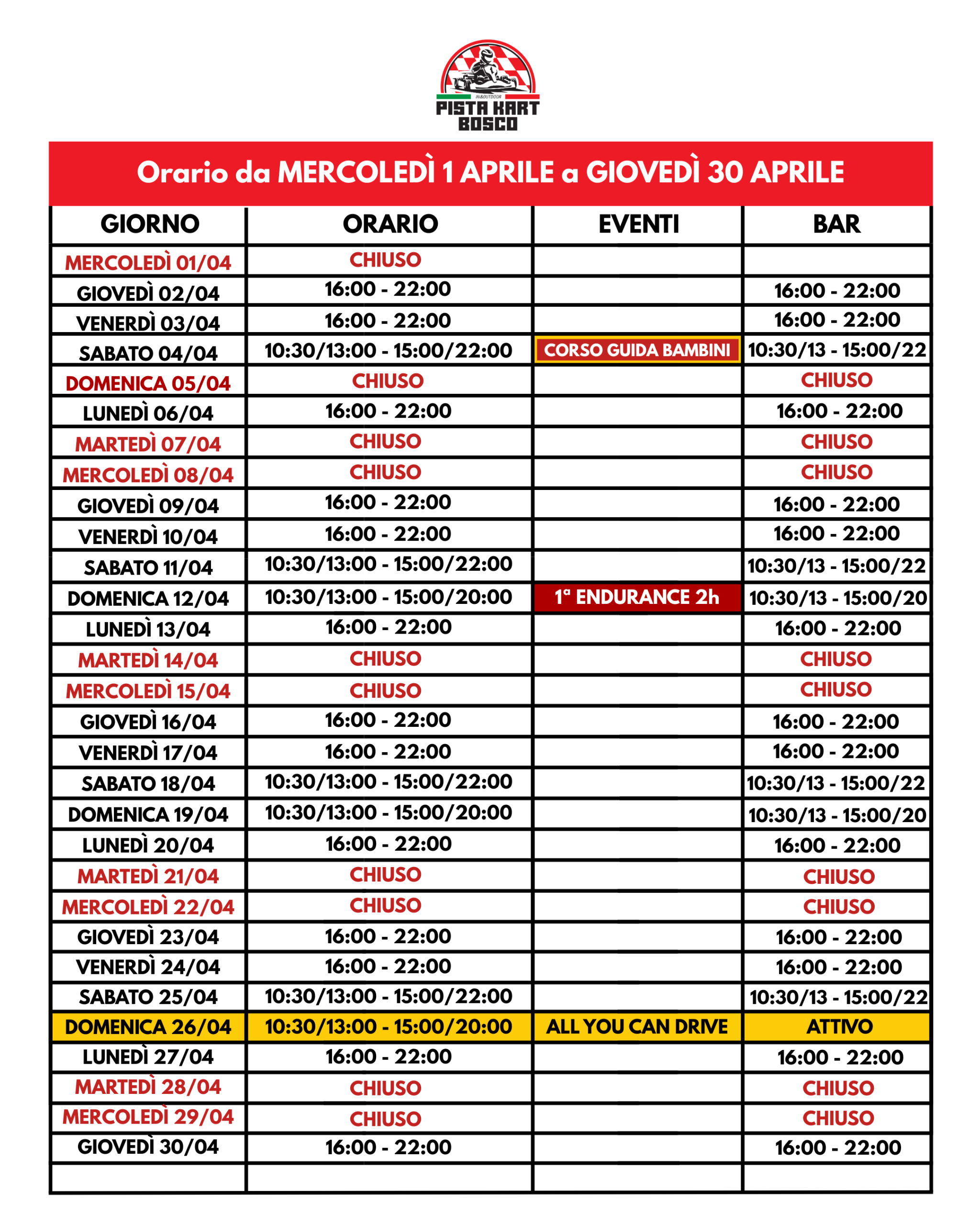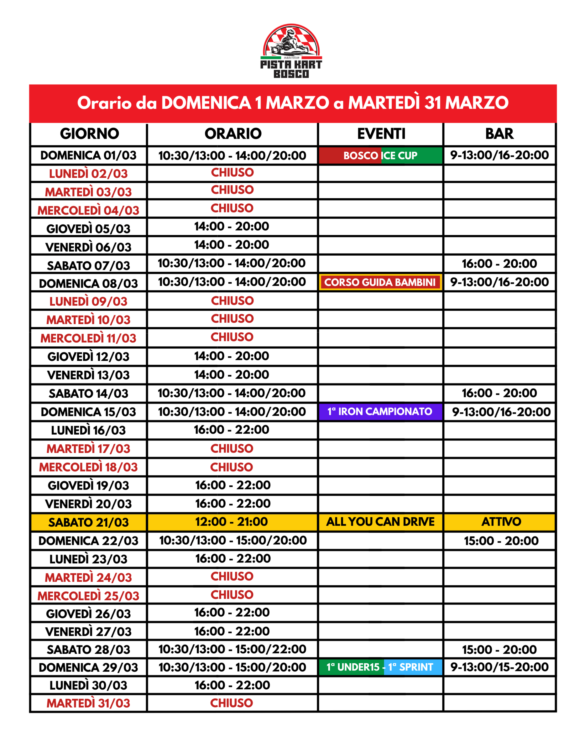 Per informazioni e prenotazioni scrivere all’indirizzo info@pistakartbosco.it oppure telefonare al numero 327 2022213